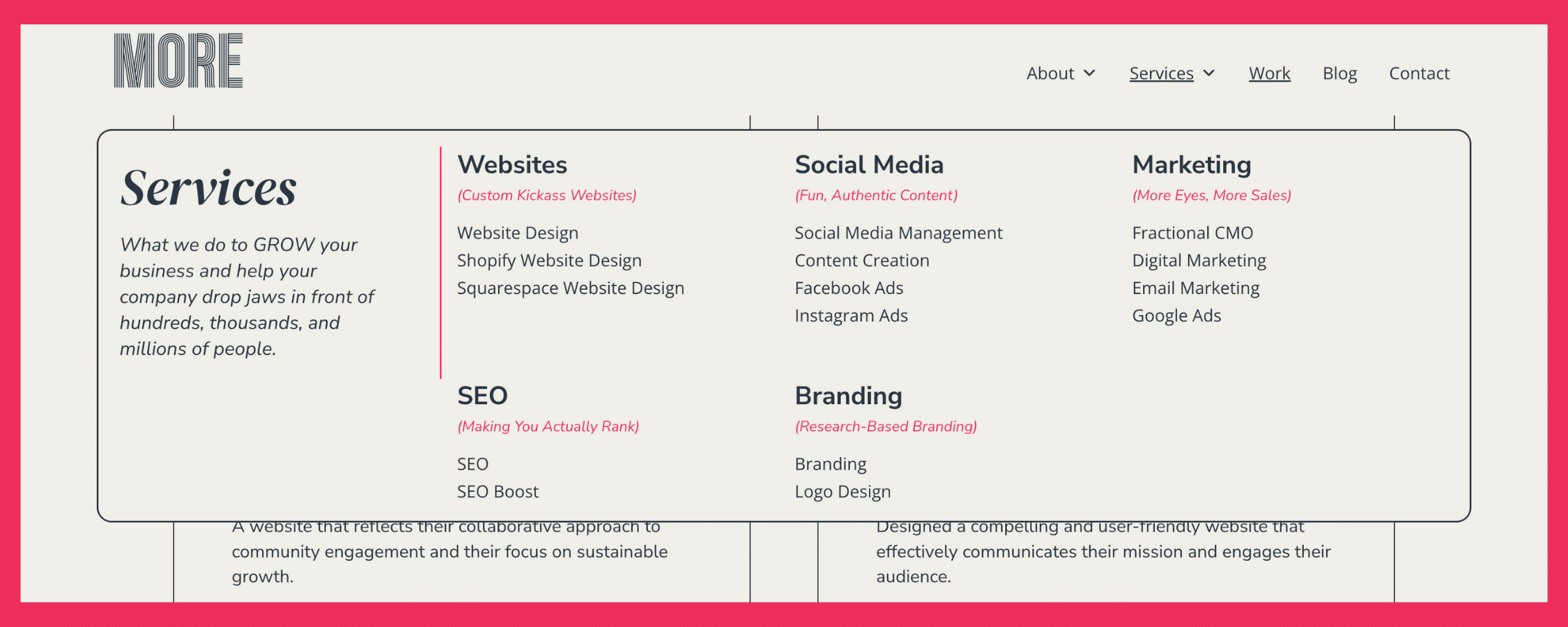 At MORE Creative Agency, we design websites that are both strategic and scalable. Whether you need a sleek one-pager or a robust, multi-page buildout, we’ll help you find the right structure to support your brand and your bottom line.