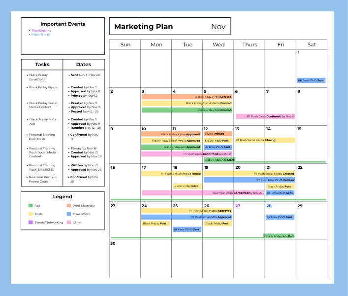 One example of how we plan out our client’s marketing is with a comprehensive year long plan so our clients can see exactly what we are working towards and when. This leads to peace of mind and way more effective results. Check out this preview of one below for one of our gym clients:
