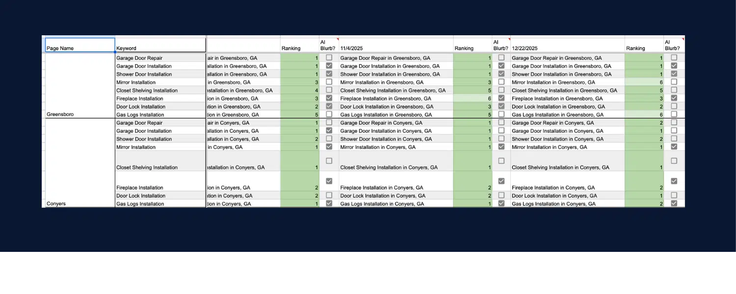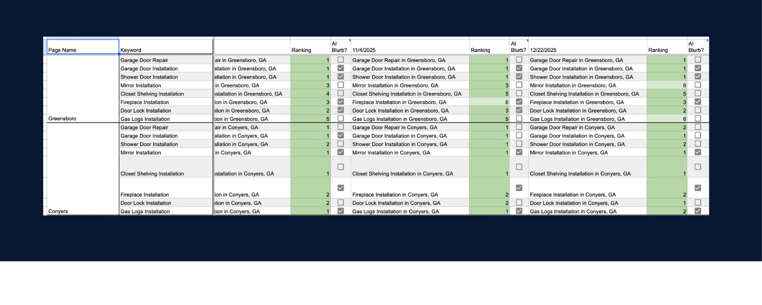 SEO is an ongoing process. MORE sets measurable objectives for 2026, including traffic growth, higher rankings, and more leads. We monitor performance regularly using tools like Google Analytics and Google Search Console, and we track your search rankings over time in detailed spreadsheets to monitor your results across dozens of keywords and cities. This allows us to adjust strategy when needed, keeping your site aligned with search trends and business priorities. You don’t have to guess whether changes are working. Data guides every decision, and our team makes the updates so you can focus on running your business.