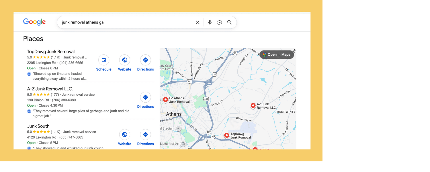 Here’s a breakdown of the most important ways your business can appear on Google, why each one matters, and what you can do to improve your visibility. We’ll also show real examples from one of our Athens SEO clients, Top Dawg Junk Removal.