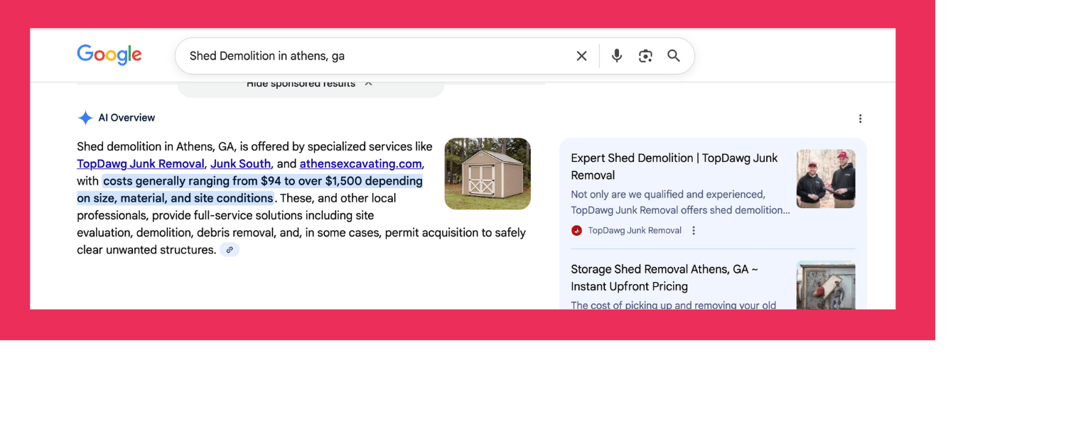Top Dawg Junk Removal appears in the AI Overview for “shed demolition athens ga.” Google recommends them and links directly to their shed demolition page, specifically highlighting their expertise. This happened because their website content clearly explains what they do, how they do it, and why they are qualified.