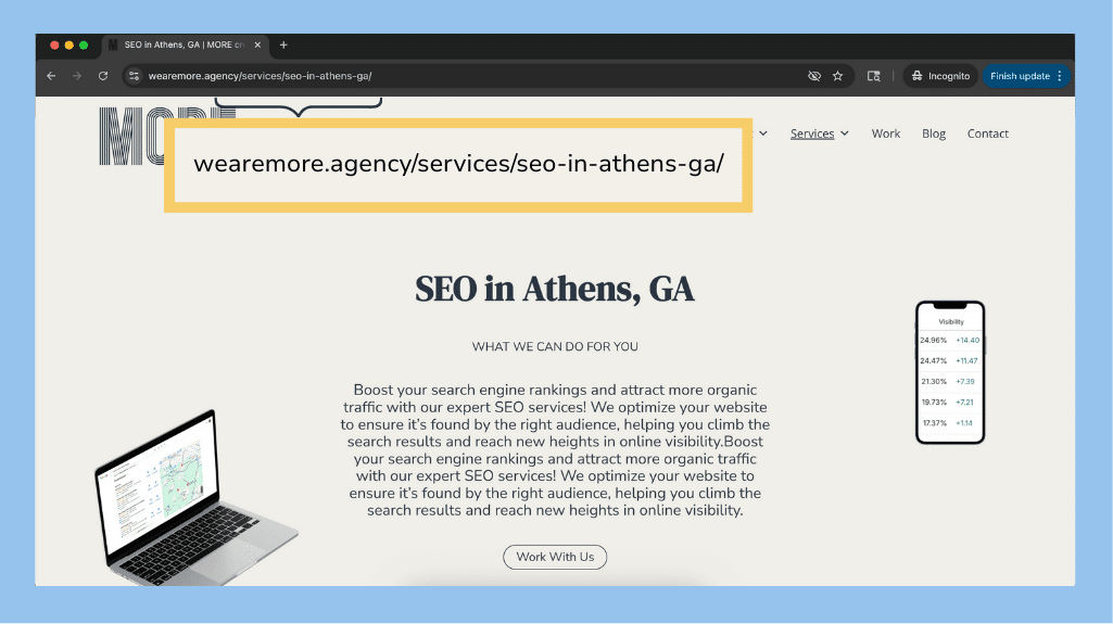 At MORE Creative Agency, we help businesses across Athens and the surrounding area improve both on-page and off-page SEO. Whether you need a full content overhaul or backlink strategy, we’re here for it.